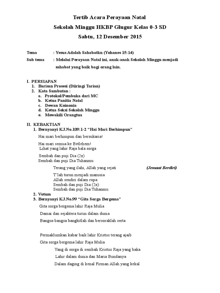 Tata Ibadah Natal Skm from imgv2-1-f.scribdassets.com 1 + 2 hai mari berhimpun hai mari berhimpun dan bersukaria hai mari semua ke betlehem lihat yang lahir raja bala sorga sembah dan puji dia | 3x tuhanmu ! Hkbp pondok gede perayaan natal sekolah minggu. Alam raya berkumandang oleh pujian mulia senin, 19 desember 2016 dari gunung dari padang. Ibu novi & kak eva firman tuhan : 1+ 5 alam raya berkumandang sekolah minggu hkbp ressort. Ajak dan libatkan seluruh guru sekolah minggu untuk. Tipe data bilangan bulat dalam bahasa pemrograman pascal. Tertib acara perayaan natal simanjuntak.